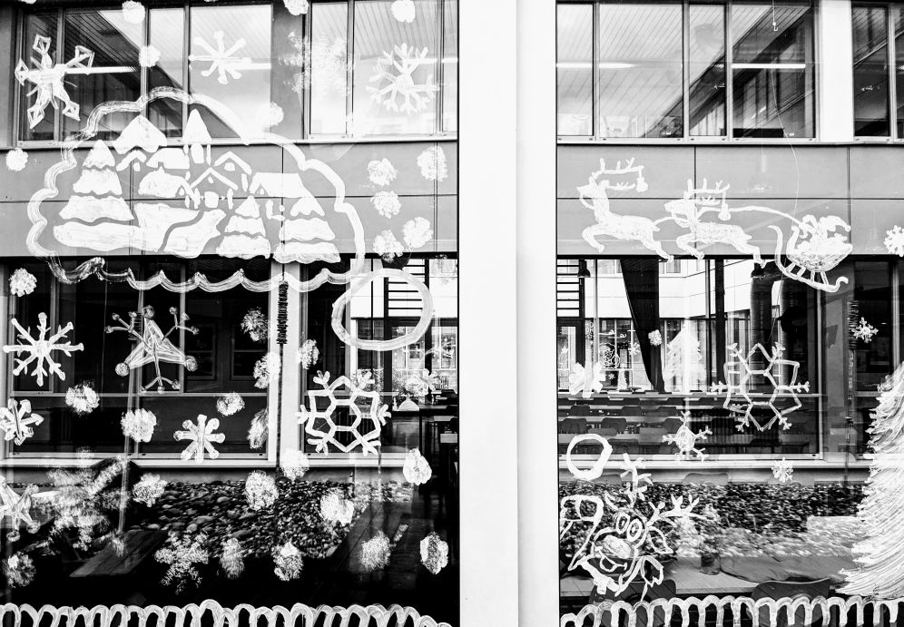 Getreu dem Motto ,,Bleibt der Schnee aus, machen wir selber welchen" wurde die Aula in diesem Jahr pünktlich zum Weihnachtsmarkt zum Thema ,,Schneegestöber" dekoriert. In der Schulbibliothek verbindet sich Literatur mit Kunst. Die 8d hat im Kunstunterricht die Bibliothek an Scheiben und Fenstern mit Kreidefarbe weihnachtlich bemalt. Außerdem gibt es dort in der letzten Schulwoche vor den Weihnachtsferien eine Ausstellung mit Tonobjekten und Comiczeichnungen der 7a, 7c und 9b.